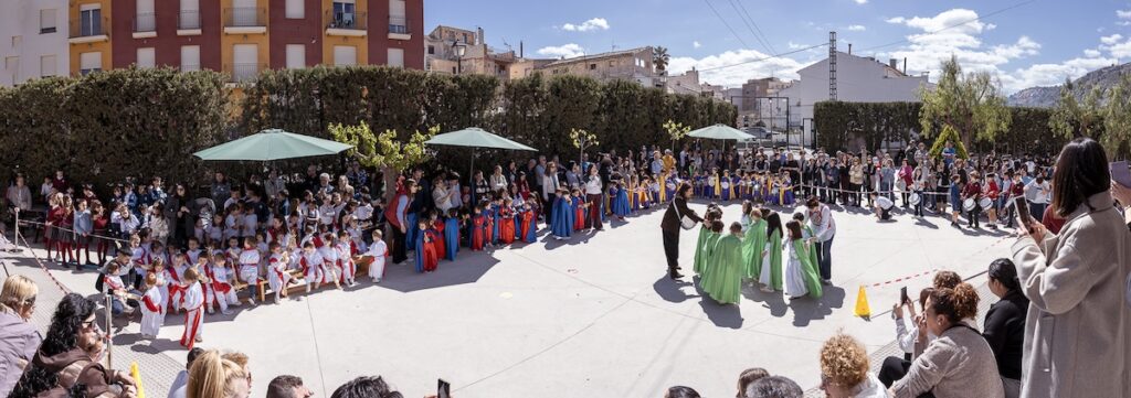 Los protagonistas absolutos de la mañana son nuestros alumnos de Primer y Segundo Ciclo de Infantil. Con el apoyo de los padres, que asisten con orgullo a este desfile, y el alumnado de educación primaria, el patio se llena de colorido con las túnicas que representan nuestra identidad: blancos con mantos colorados, morados con capas doradas, colorados con capas azules y blancos con capas verdes.